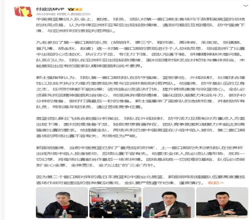 中國男籃的集訓(xùn)入隊會上,郭振明表示‘中男籃已經(jīng)到了最危險的時候’,上一個窗口期的二連敗讓球隊在世界杯出線形勢極度被動,后續(xù)的比賽不容有失,需要全體人員認(rèn)清形勢放棄一些幻想,把每一場比賽當(dāng)最后一場去拼。