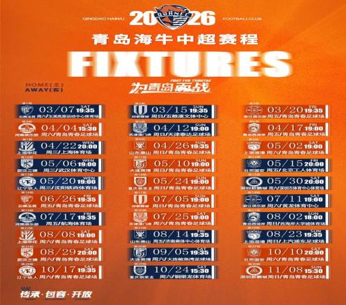 2026賽季中超聯(lián)賽賽程公布,青島海牛官方發(fā)布了俱樂部的中超賽程。海牛首輪客戰(zhàn)云南玉昆,第6輪迎來與西海岸的青島德比,第8輪將會(huì)主場(chǎng)迎戰(zhàn)山東泰山。