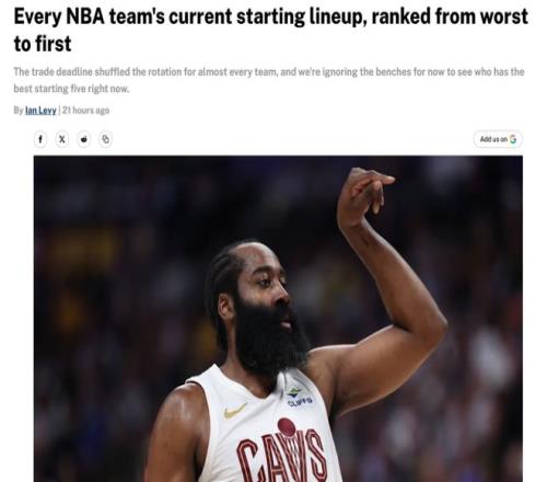 美媒評(píng)30隊(duì)首發(fā)實(shí)力!騎士獲哈登后飆升第4火箭第7湖人17存爭(zhēng)議