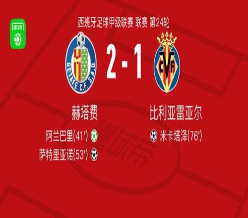 北京時間2月14日西班牙足球甲級聯(lián)賽 聯(lián)賽 第24輪,赫塔費主場對陣比利亞雷亞爾。赫塔費阿蘭巴里破門,薩特里亞諾破門。比利亞雷亞爾米卡塔澤破門。最終比分赫塔費 2-1 比利亞雷亞爾。