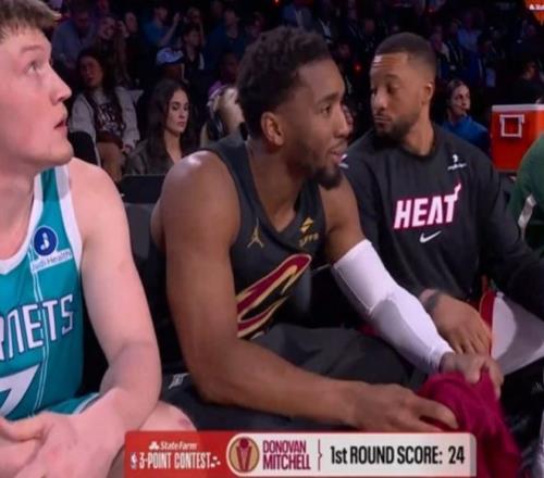 第二位登場(chǎng)的是騎士球星米切爾,他第一個(gè)點(diǎn)五連中,右側(cè)弧頂5中4包括花球,隨后超遠(yuǎn)球不中。米切爾中路弧頂命中3球包括花球,隨后左側(cè)超遠(yuǎn)球不中,左側(cè)弧頂5個(gè)花球只進(jìn)2球,最后一個(gè)底角命中4球,最終得到24分。