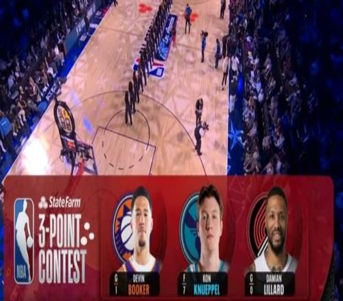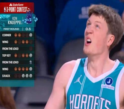 預(yù)賽比拼,第一位登場(chǎng)的是黃蜂新秀克努佩爾,他在第一點(diǎn)命中3球包括花球,第二個(gè)點(diǎn)命中3球,隨后超遠(yuǎn)球不中,中路弧頂命中4球,隨后右側(cè)弧頂超遠(yuǎn)球??伺鍫栔髠?cè)翼5連中手感火爆,底角命中3個(gè)花球,成功得到27分表現(xiàn)出色。