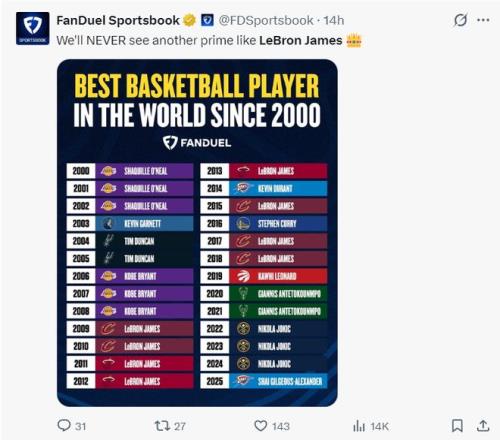 美媒FanDuel曬出了自2000年后聯(lián)盟最出色的球員,2000-2002年奧尼爾、2003年加內(nèi)特、2004-2005年鄧肯,2006-2008年科比,2009-2013年詹姆斯,2014年杜蘭特,2015年詹姆斯,2016年庫里,2017-2018年詹姆斯,2019年倫納德,2020-2021年揚(yáng)尼斯,2022-2024年約基奇,2025年SGA。詹姆斯一人有八次,美媒寫道:我們再也不會見到勒布朗這個級別的球員了。