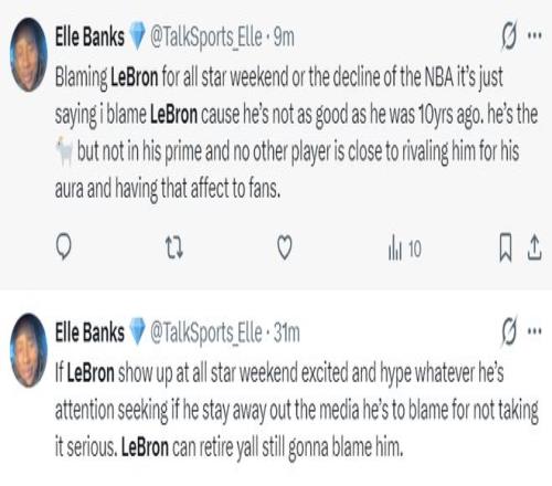 NBA記者Elle Banks寫道:如果詹姆斯在全明星表現(xiàn)的興奮且充滿激情(不管是刻意追求流量還是出于真心熱愛),那他都算正常發(fā)揮。但如果他故意避開媒體,就說明他沒有用心對待全明星賽,那么他就要為此承擔(dān)責(zé)任,就算勒布朗退役人們也會指責(zé)他。