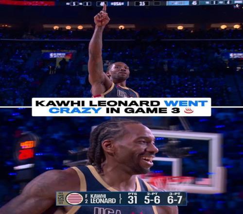 文班亞馬繼續(xù)強勢帶隊,他單節(jié)獨得19分2籃板。但這一節(jié)完全成為萊昂納德的個人表演,他13投11中,三分7中6,一人狂砍31分!最后時刻還用一記三分球幫助條紋隊鎖定勝局。