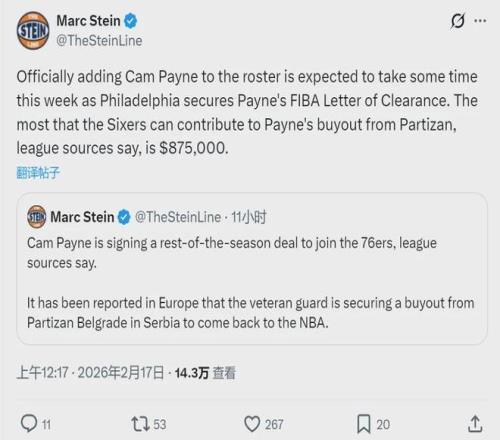 也就是說,剩余的87.5萬買斷費(fèi)需要佩恩自掏腰包。2024年夏天,亞布塞萊為了重返NBA,自己支付了165萬美元的買斷費(fèi)、加盟76人!2025年10月份,步行者曾經(jīng)給了佩恩一份訓(xùn)練營合同,佩恩被裁之后離開NBA、前往歐洲打球。