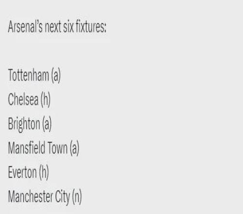 阿森納未來6場比賽:客戰(zhàn)熱刺、主戰(zhàn)切爾西、客戰(zhàn)布萊頓、客戰(zhàn)曼斯菲爾德、主戰(zhàn)埃弗頓、卡拉寶杯決賽對曼城。