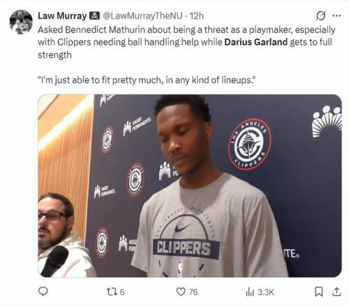 快船新援馬瑟林談到加蘭還無法登場,他表示:我基本上可以在任何陣容中找到自己的位置,球隊(duì)需要我做組織核心時(shí)我就會(huì)去做,尤其是在加蘭缺席快船需要加強(qiáng)控球能力的情況下。
